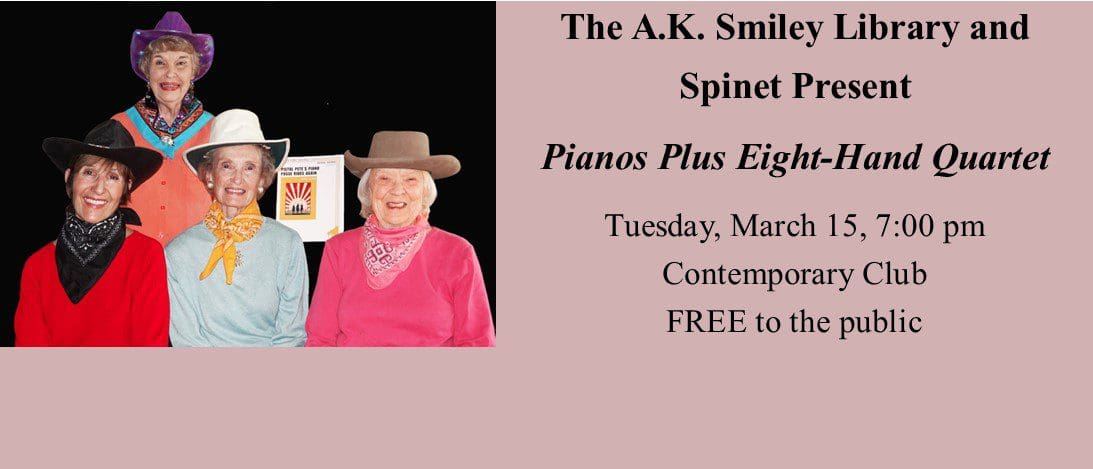 The A.K. Smiley Library and Spinet Present Pianos Plus Eight-Handed Quartet The A.. Smiley Public Library is proud to co-sponsor the “Pianos Plus” eight-hand quartet