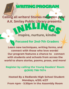 Register by calling the Young Readers’ Room at (909) 798-7674.