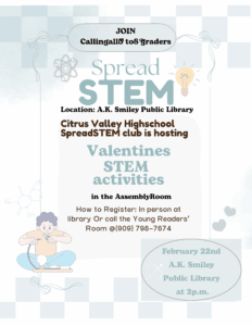 Citrus Valley High School SpreadSTEM Club will be here to engage students with science on Sunday, 2/22 in the Assembly Room.