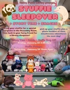 Stuffie Sleepover Stuffie Sleepover! See flyer for information. + Add to Google Calendar + iCal / Outlook export 00 days 00 hours 00 minutes 00 seconds Date Jan 23 2026 Time 3:30 pm - 4:00 pm Share this event