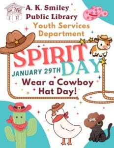 Join the Youth Services Crew in this month’s Spirit Day by wearing a Cowboy Hat! Stop by the Young Readers’ Room and say “Howdy”!