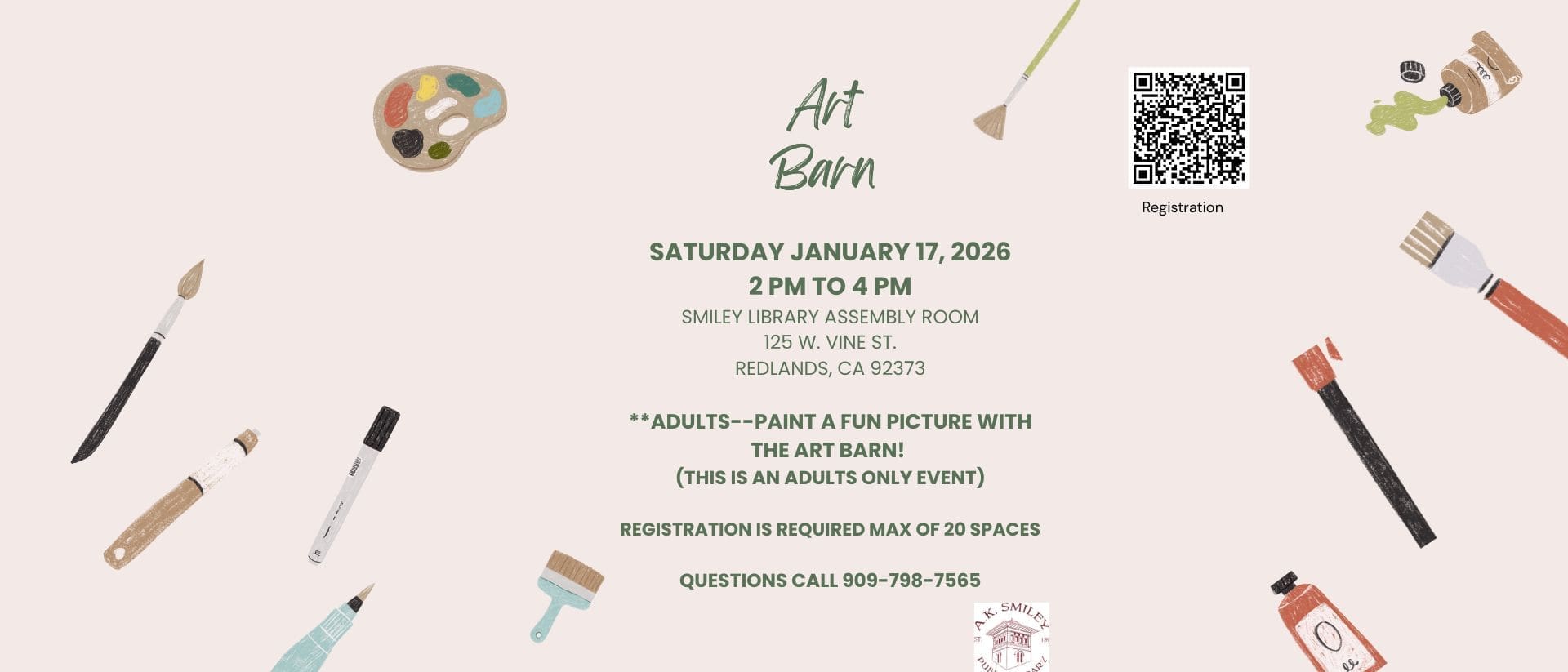 Adults –paint a picture with the Art Barn on Saturday Jan. 17th from 2:00-4:00pm in the library assembly room. Registration is required and can