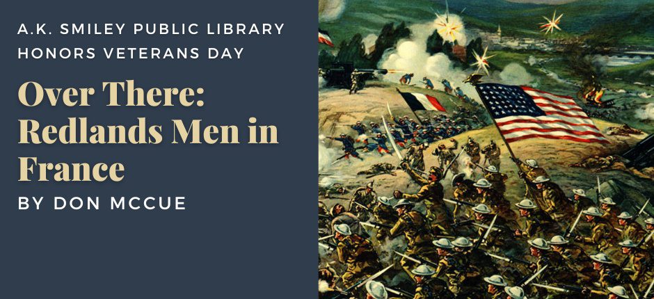 Due to scheduling conflicts, A.K. Smiley Public Library’s program commemorating Veterans Day has changed. Join us on Saturday, November 9 at 11am in the Assembly Room and on Zoom with a presentation by Smiley Library Director Don McCue. “Over There: Redlands Men in France,” will focus on Redlanders who served during World War I. From Cantigny and Belleau Wood to St. Mihiel and the Meuse Argonne, men from Redlands participated in all of America’s great 1918 battles and 40 would make the ultimate sacrifice.